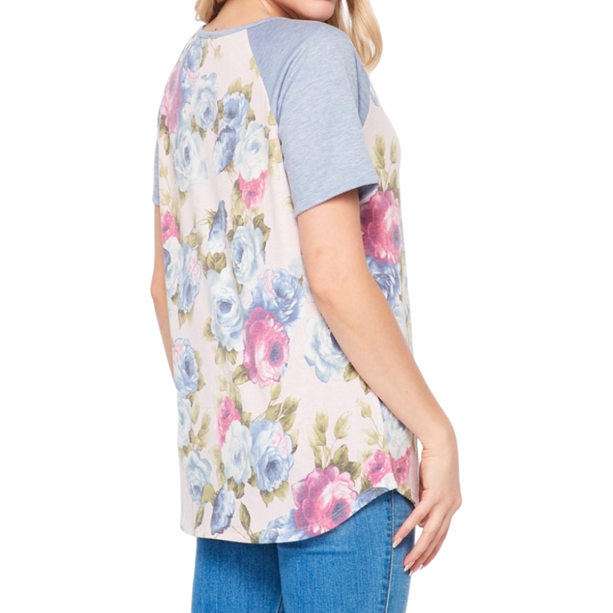 Short Sleeve Round Neck Floral Button Up Knit Top