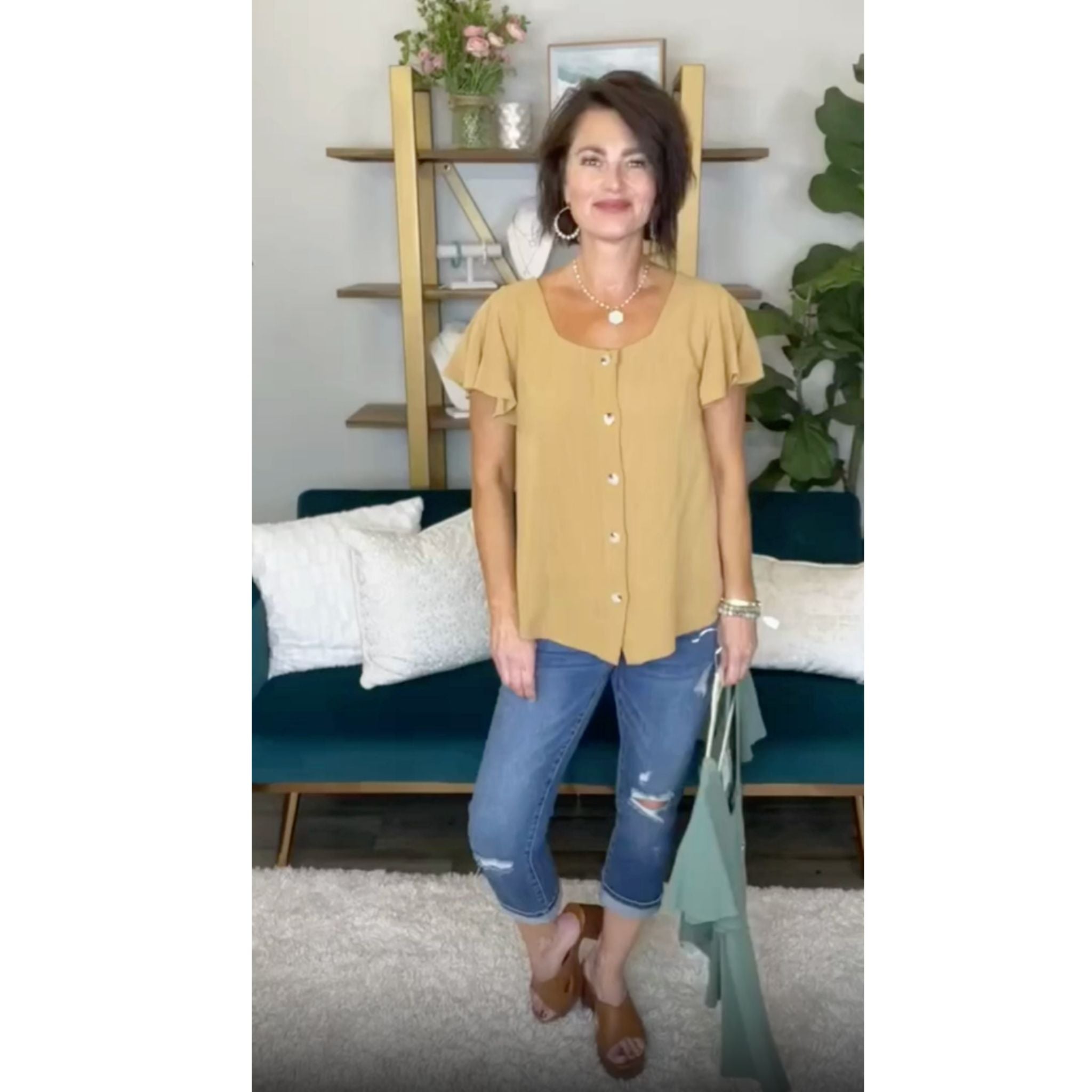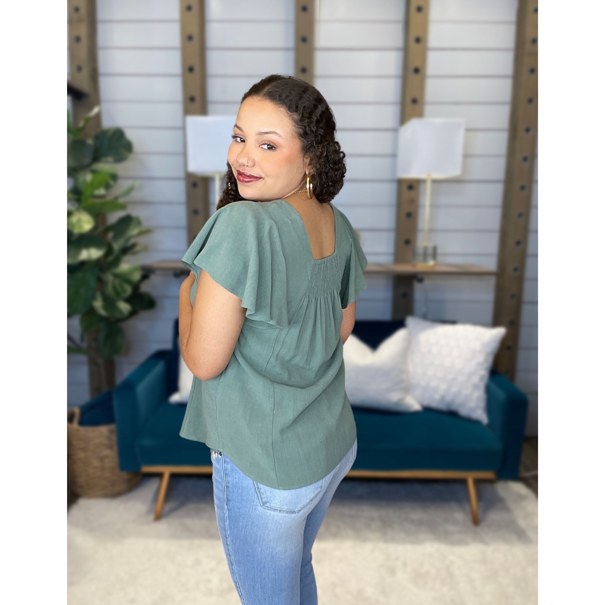 Short Flounce Sleeve Square Neck Button Up Top featuring a Smocked Back and Round Hem