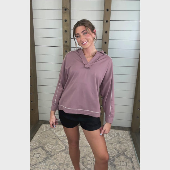 Long Sleeve Drop Shoulder Collared Pullover Top Featuring Contrast Piping, Raw Edge Details, & Side Slits