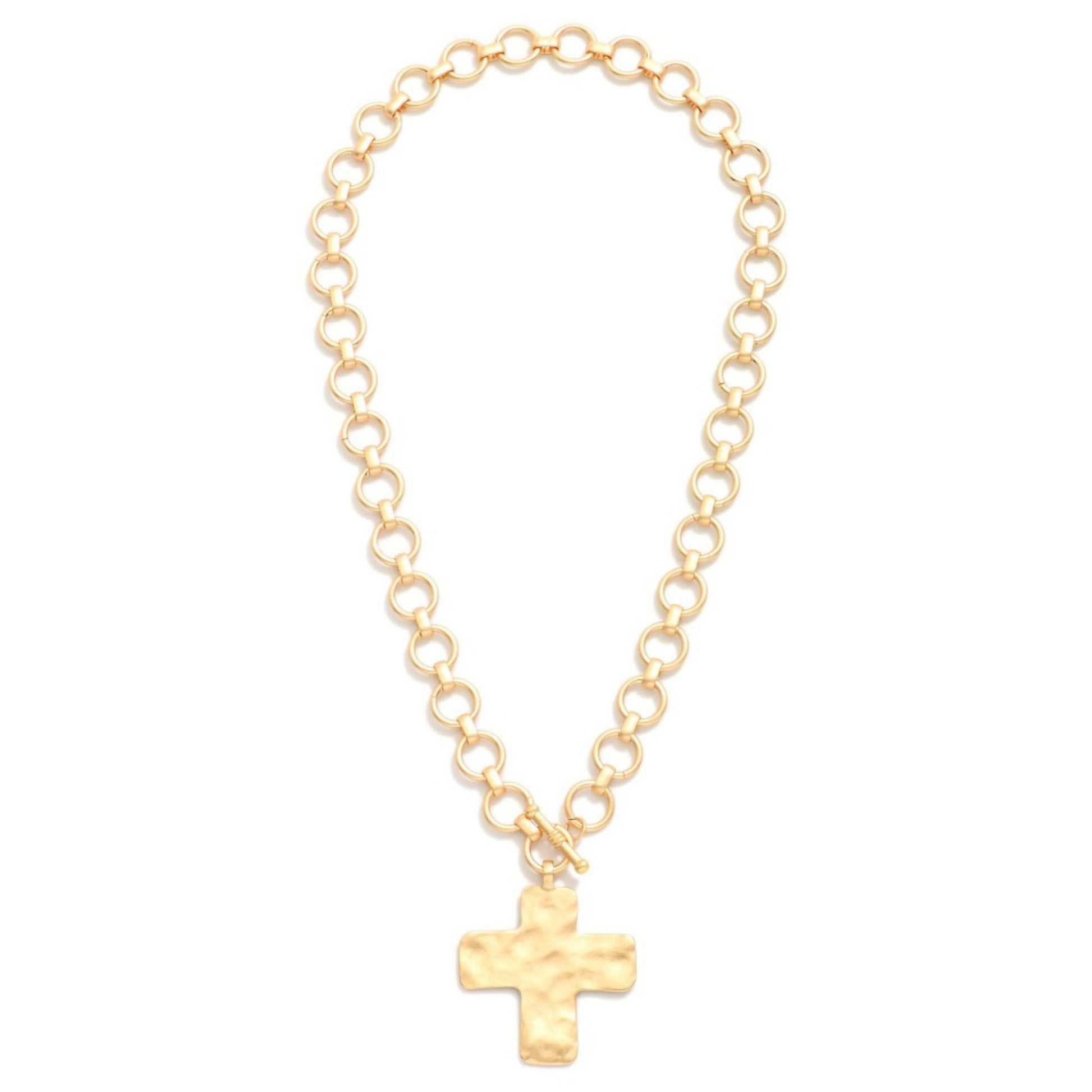 Metal Tone Circle Link Necklace Featuring Cross Pendant