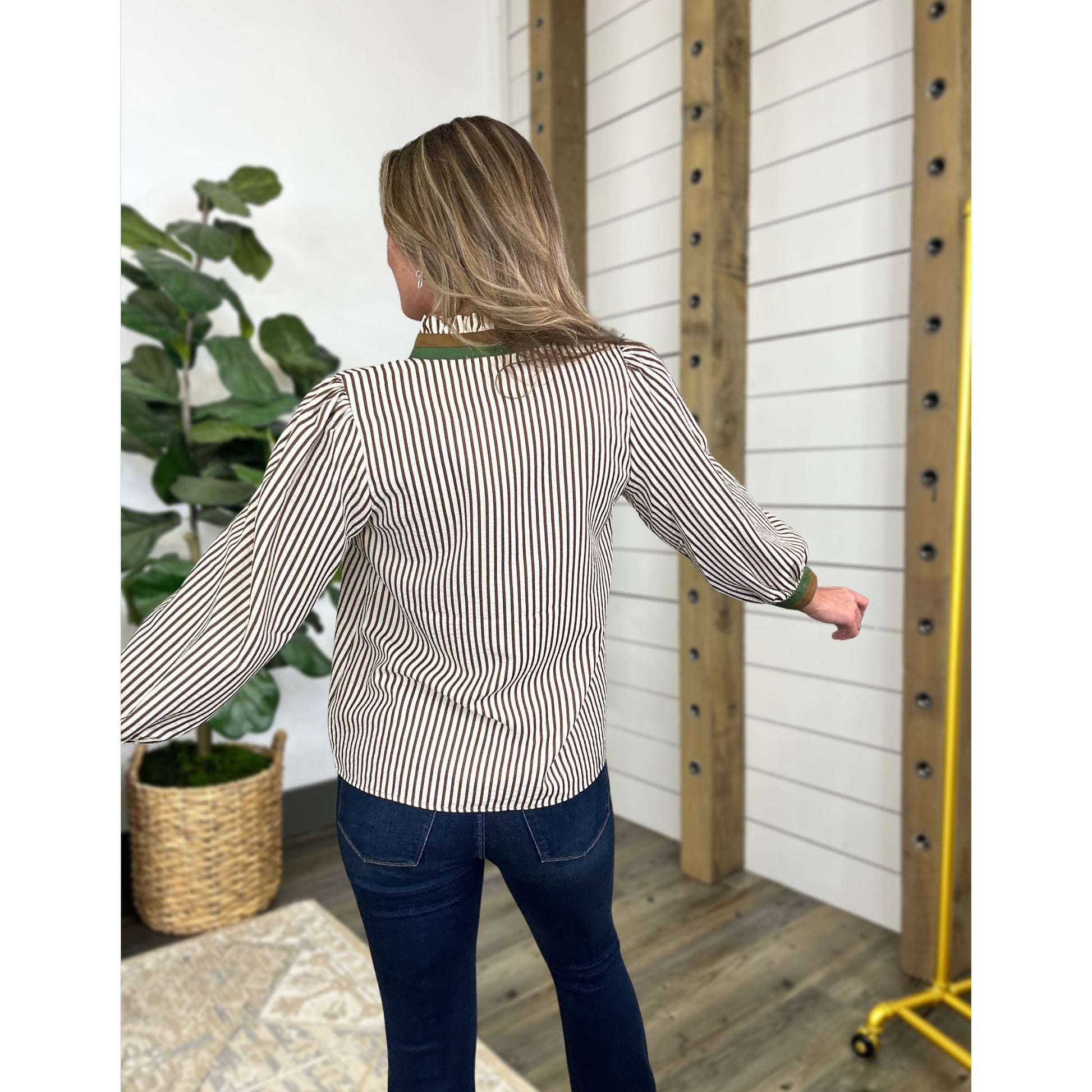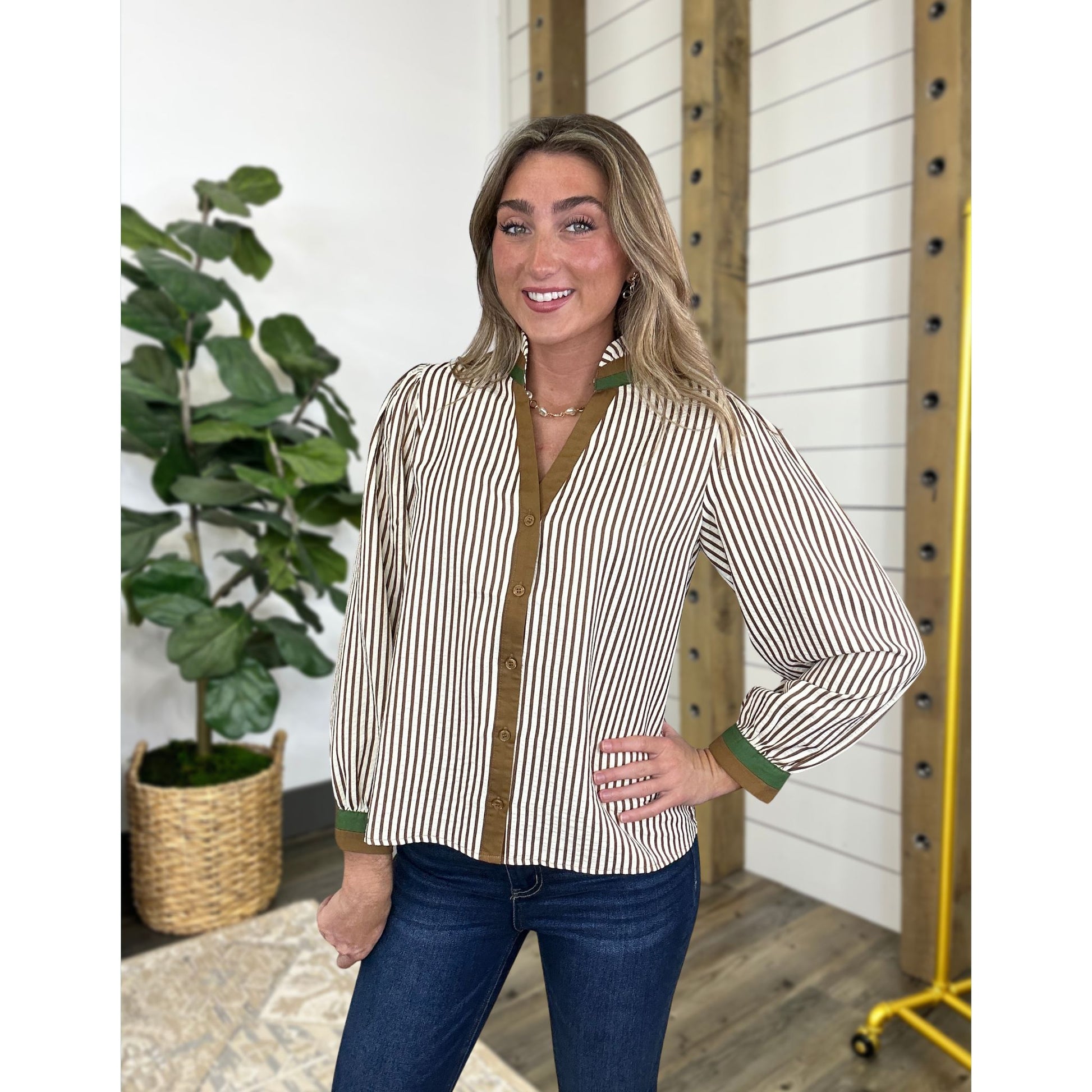 Long Sleeve Button Down Stripe Top Featuring Ruffle Neckline and Contrast Binding Trim