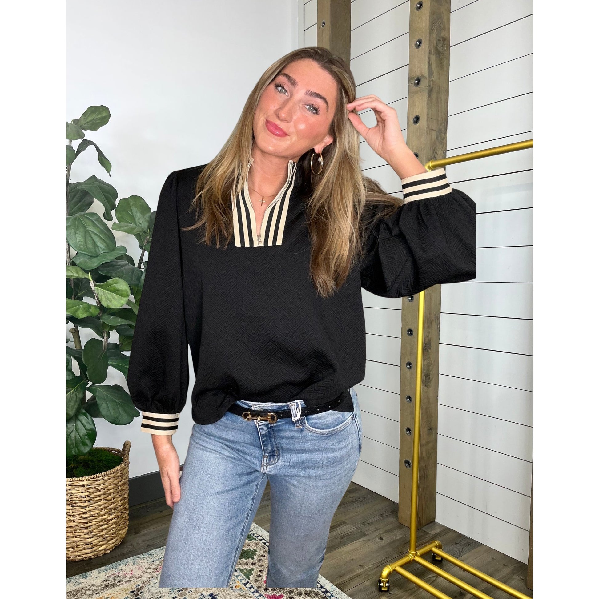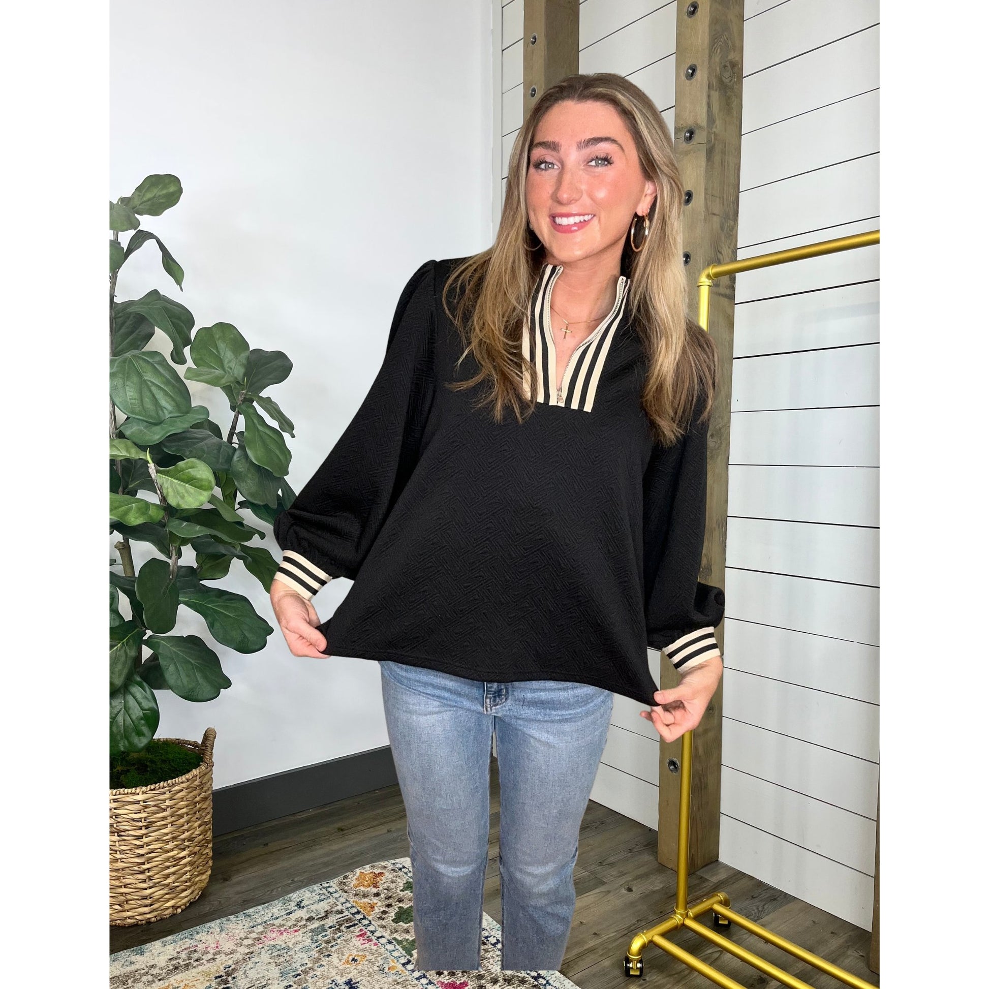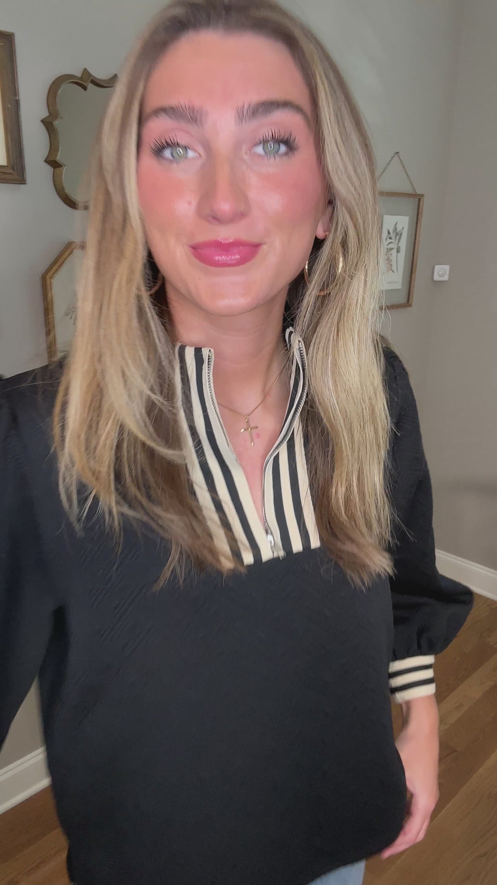 Long Sleeve Mock Neck Textured Solid Top Featuring Front Zip Up and Contrast Stripe Detail