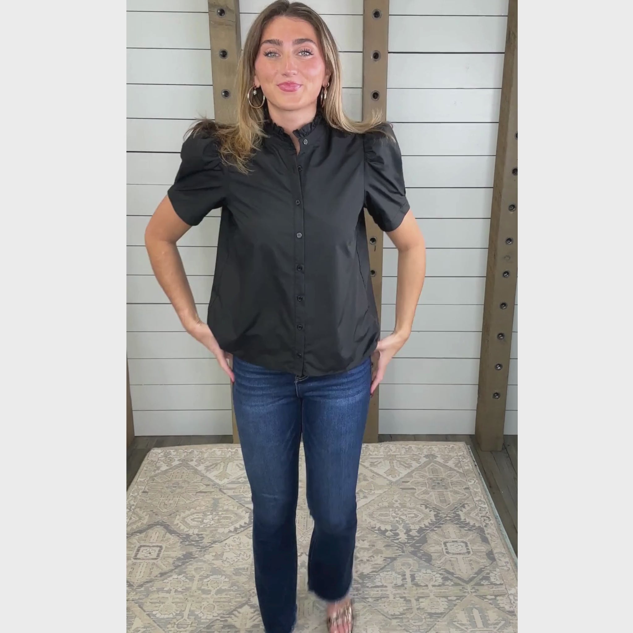 Short Puff Sleeve Ruffle Neck Solid Button Down Top Featuring Pleating Detail on Sleeve and Back