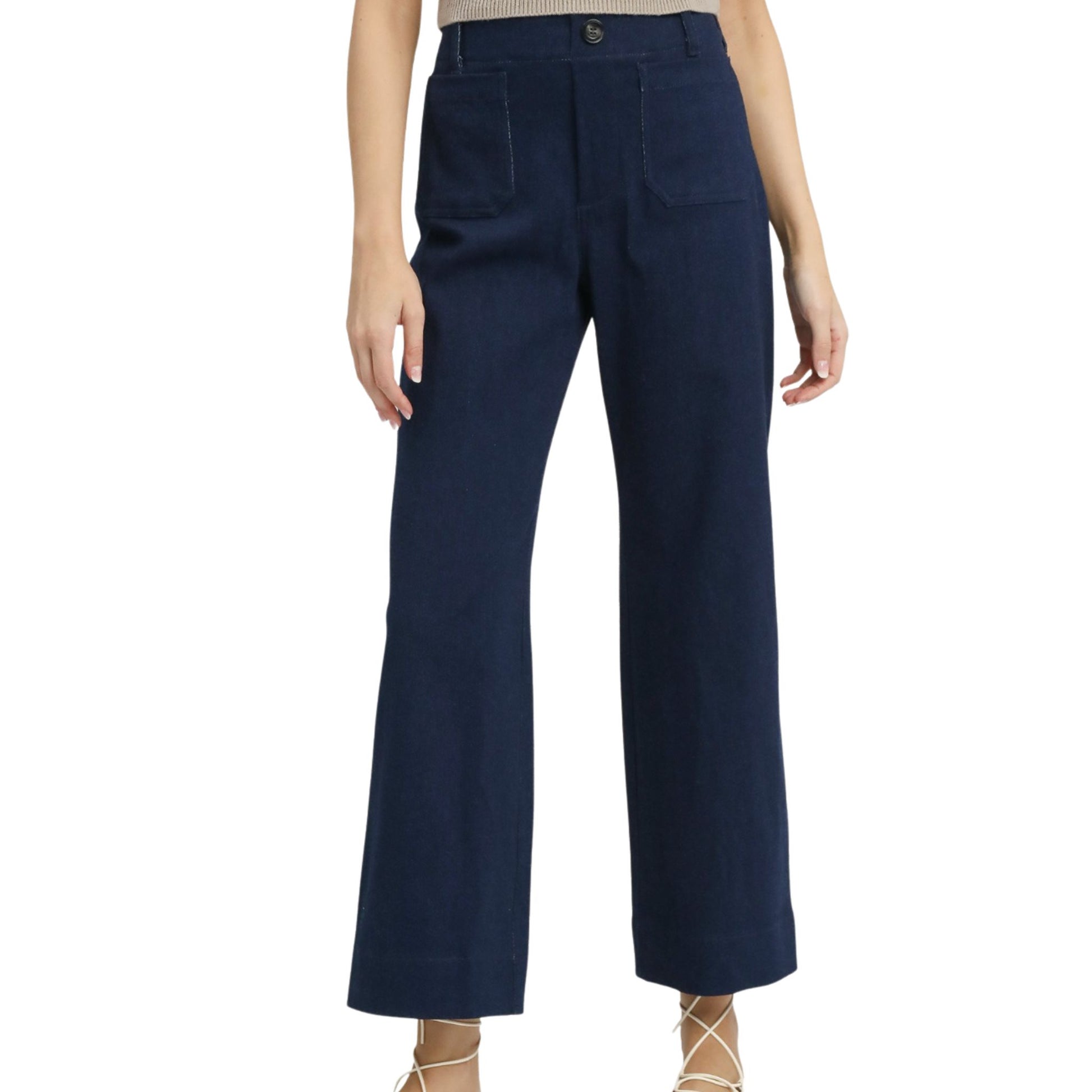High Rise Wide Leg Denim Pants Featuring Back Stretch-Band Waist, Front Patch Pockets, Back Patch Pockets, and Front Zip Buttoned Closure