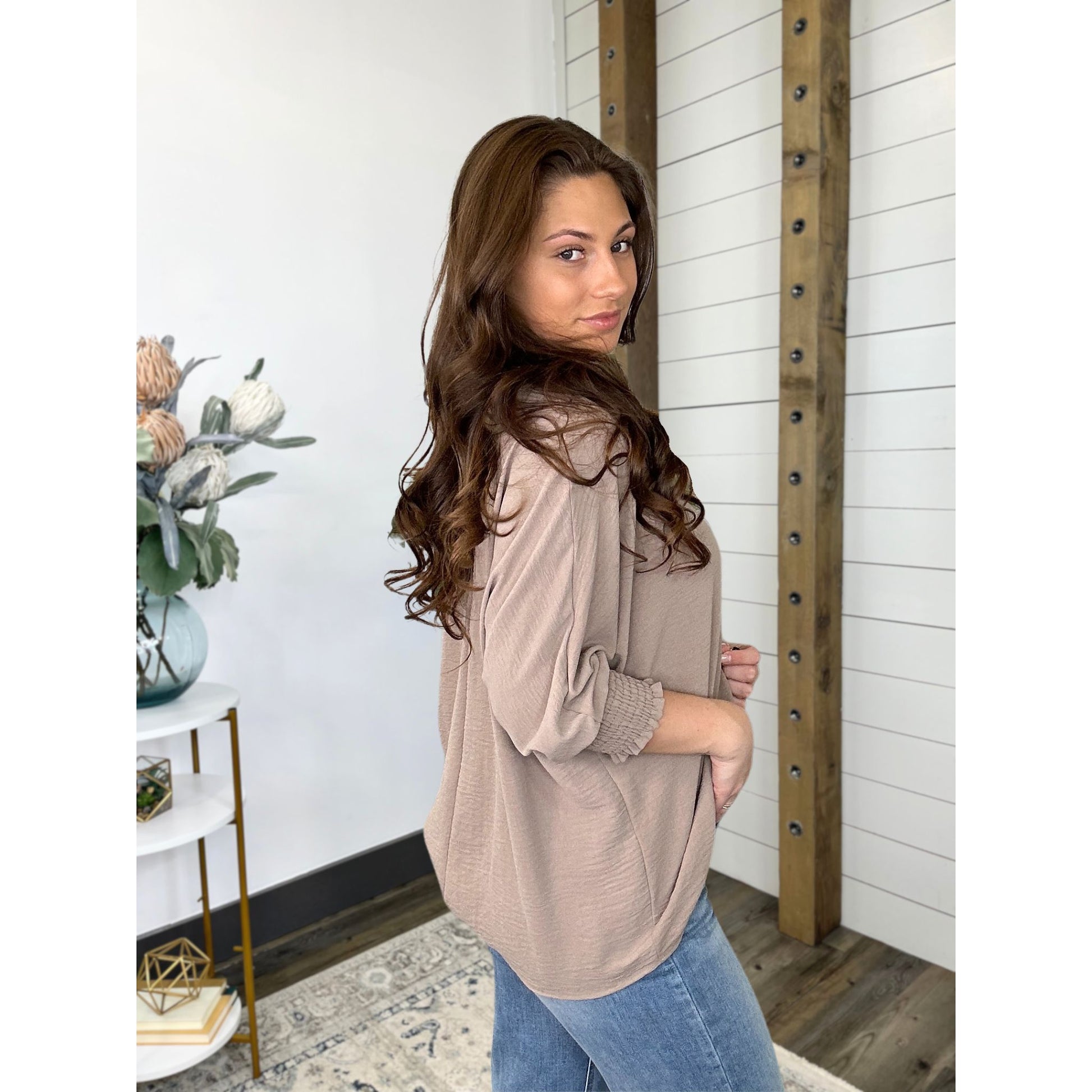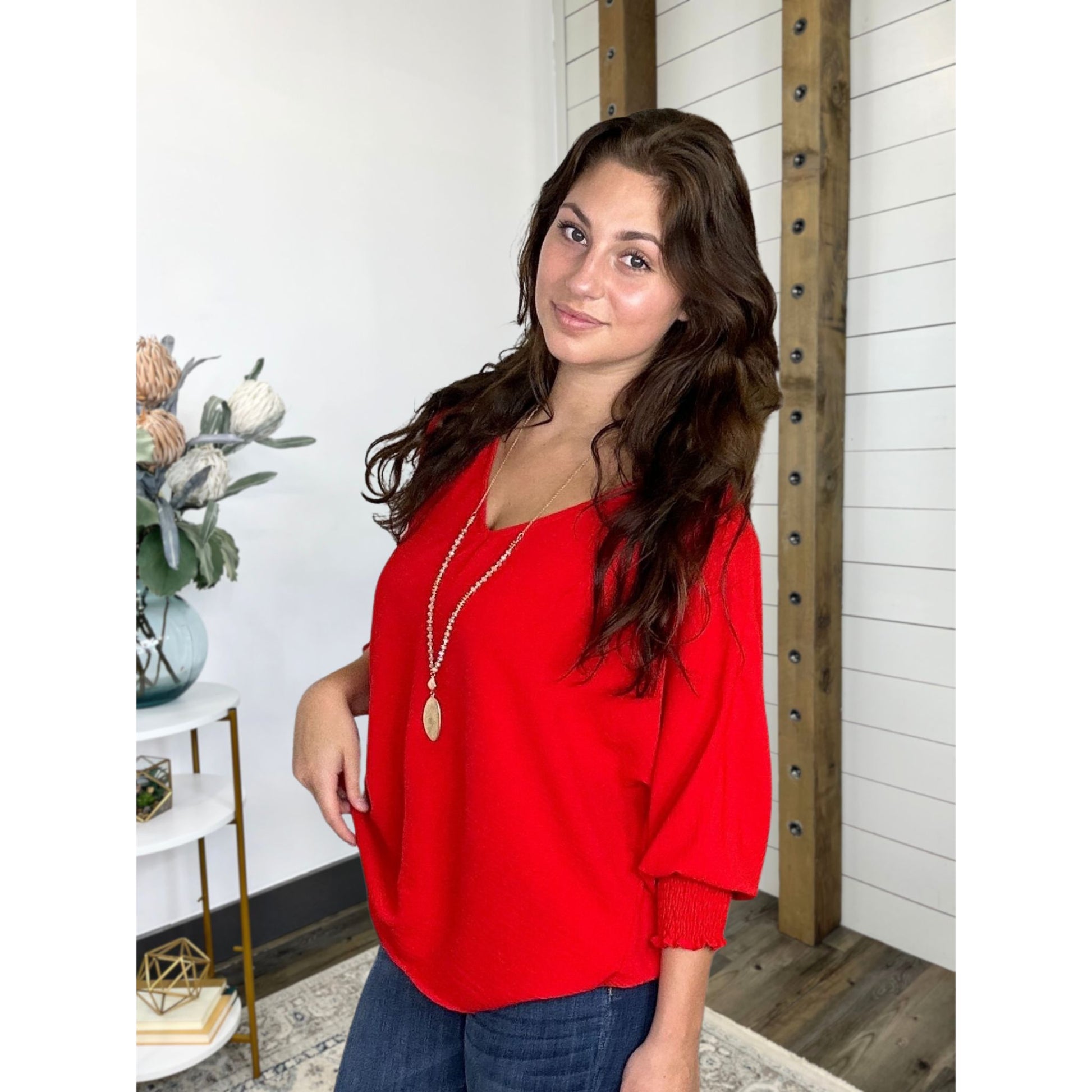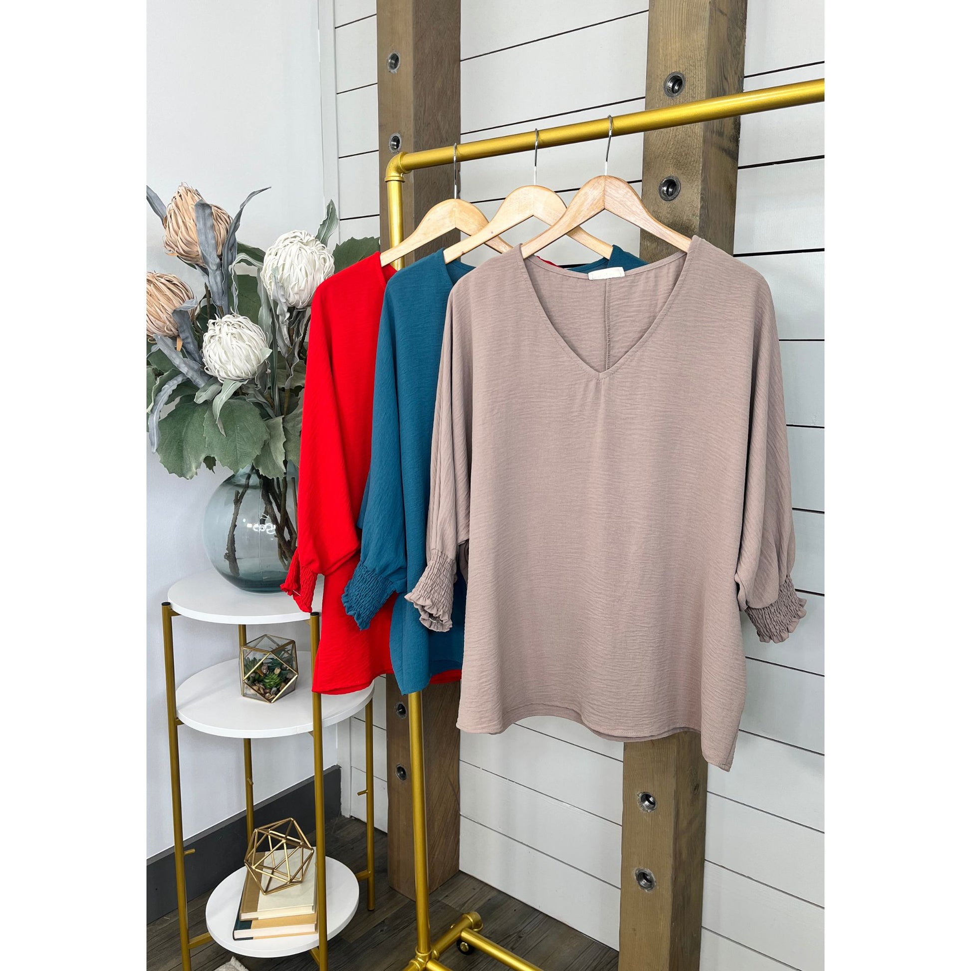 3/4 Smocked Dolman Sleeve Scoop V neck relaxed Fit Top